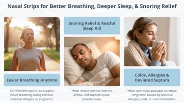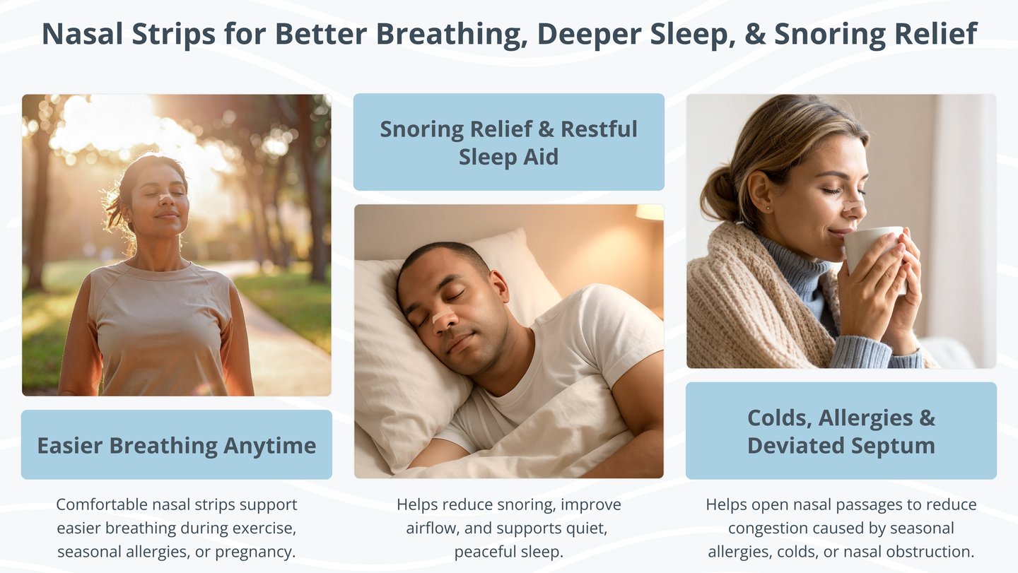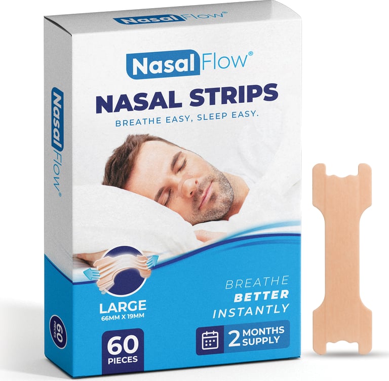 Struggling with snoring, nasal congestion, or restricted breathing at night? NasalFlow® Nasal Strips are designed to open your airways naturally, helping you breathe easier, sleep soundly, and wake up refreshed. Whether you’re dealing with allergies, a cold, or just want to improve airflow during sleep or exercise, our drug-free nasal strips provide instant relief.